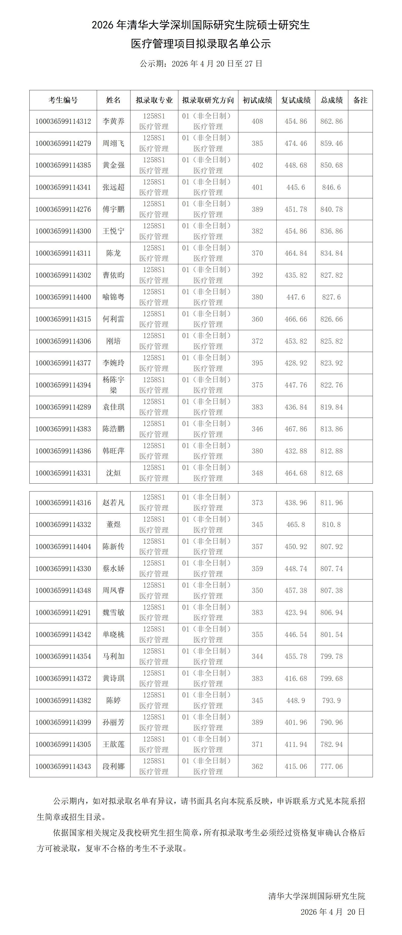 2026年医疗管理项目拟录取名单公示